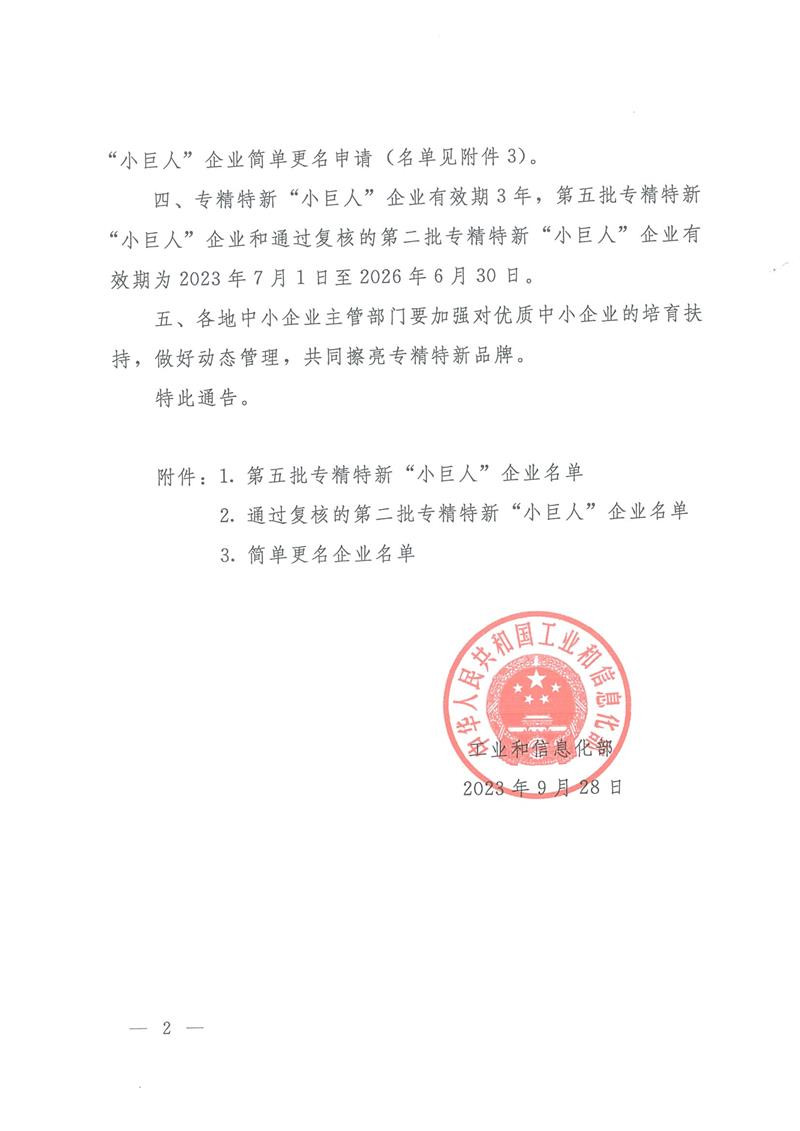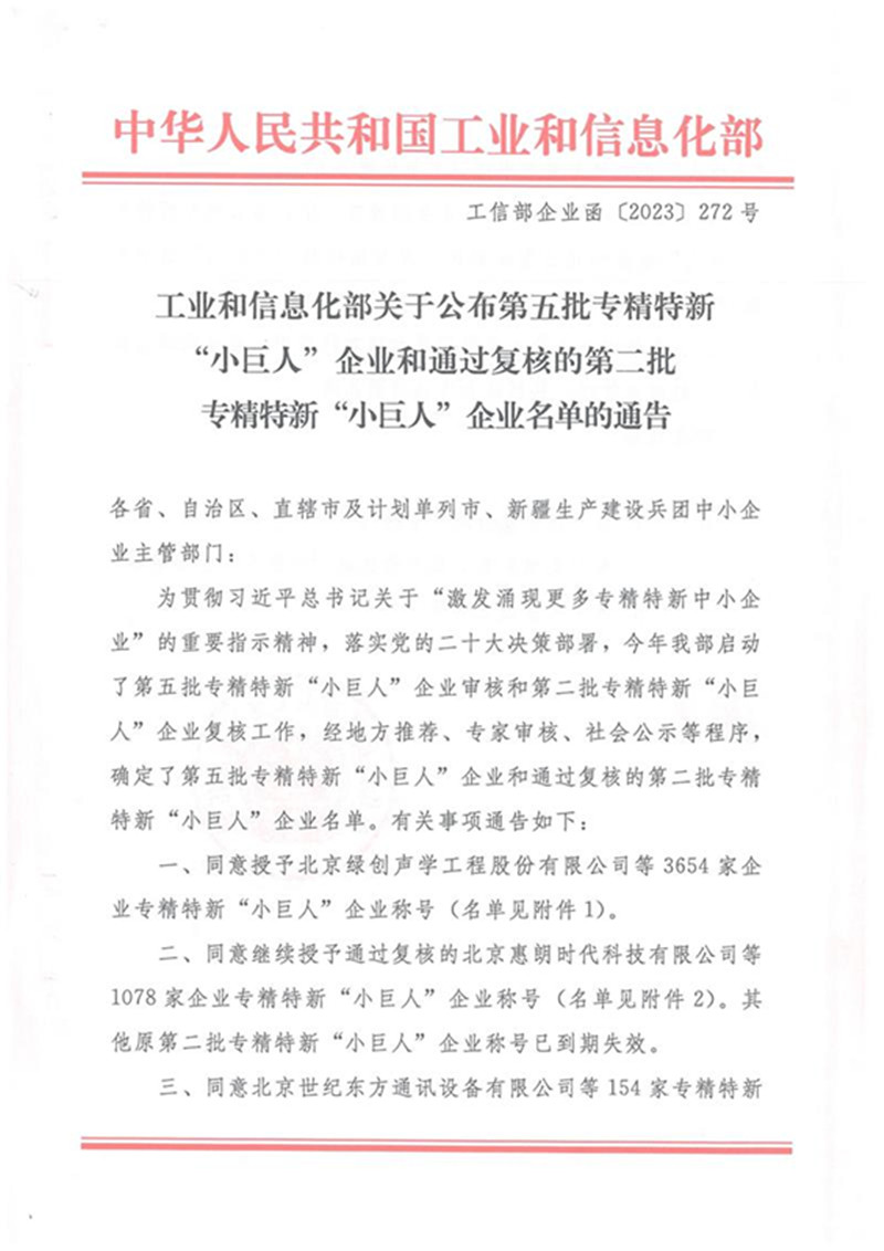 為貫徹習(xí)近平總書記關(guān)于“激發(fā)涌現(xiàn)更多專精特新中小企業(yè)”的重要指示精神,落實黨的二十大決策部署,工業(yè)和信息化部啟動了第五批專精特新“小巨人”企業(yè)審核的工作,我公司榮獲第五批專精特新“小巨人”稱號。